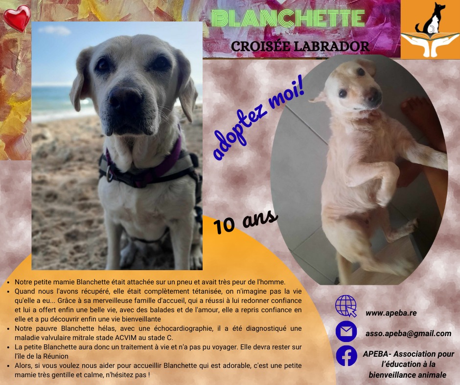 Avec l’aide de la Police nationale et de nos bénévoles, en début d'année dernière, nous avions sorti Blanchette, Princesse et Patchoune d’une situation de maltraitance terrible à Saint-Denis : attachées sur de très courtes longueurs, sans abri, dans la boue, sans soins, sans amour… oubliées au fond d’un jardin pendant des années, et certainement frappées. Blanchette, attachée sur un pneu, était terrorisée, tétanisée, et très craintive envers les hommes. On n’ose imaginer ce qu’elle a traversé… 😢 Grâce à sa fabuleuse famille d’accueil, elle a retrouvé confiance : elle découvre les balades, les caresses et enfin une vie digne ❤️ Aujourd’hui, cette petite mamie courageuse cherche une famille adoptante à La Réunion. Elle ne peut plus voyager, mais elle a encore tant d’amour à donner.