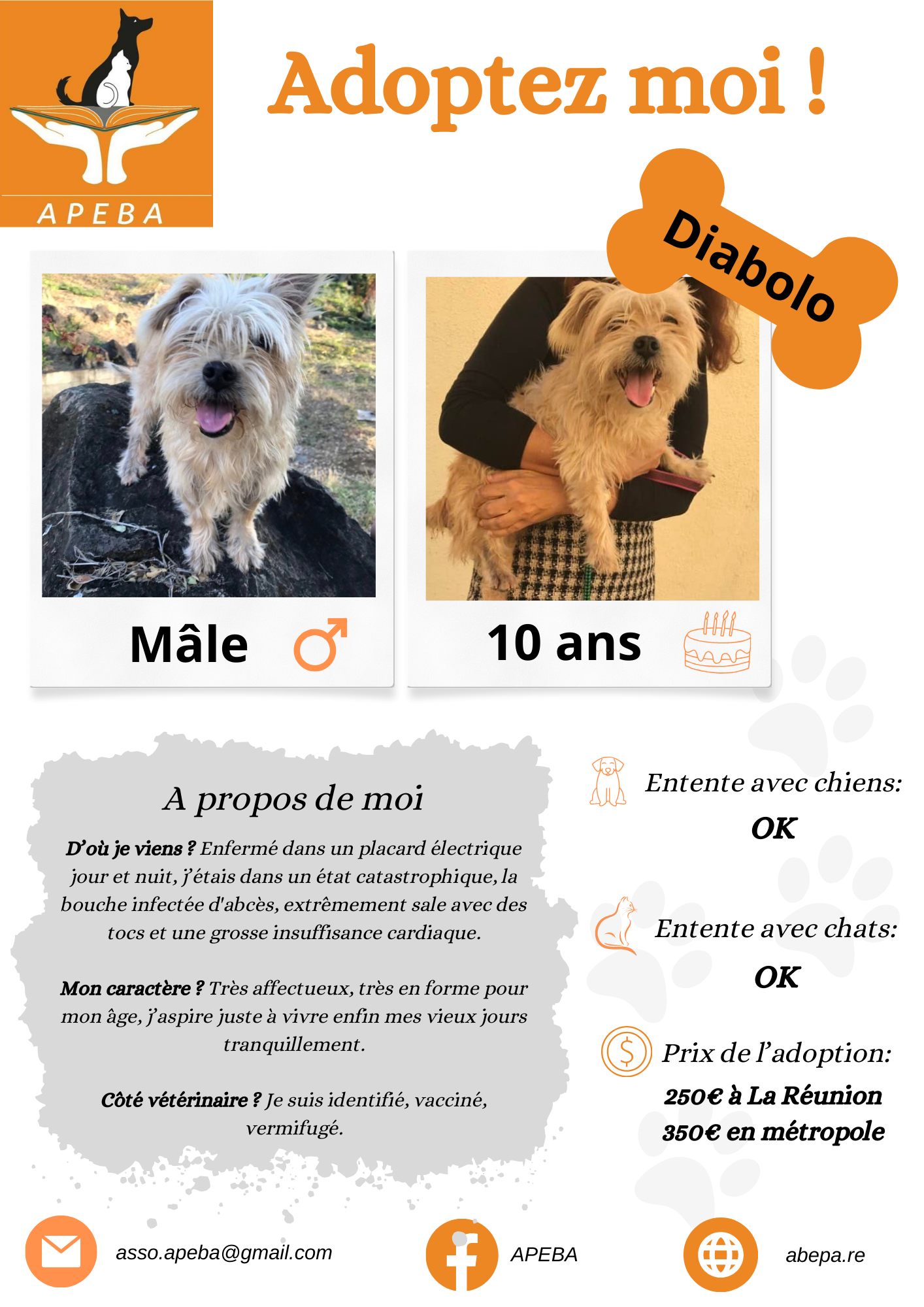 Moi c’est Diabolo, un petit cœur cabossé par la vie… J’ai connu la négligence, l’enfermement et la souffrance, mais aujourd’hui je réapprends la douceur. Grâce à une super famille d’accueil et à l’amour reçu, je vais mieux chaque jour. J’ai plus de 9 ans, j’ai traversé l’enfer, mais je suis encore là — prêt à aimer et à être aimé 💛