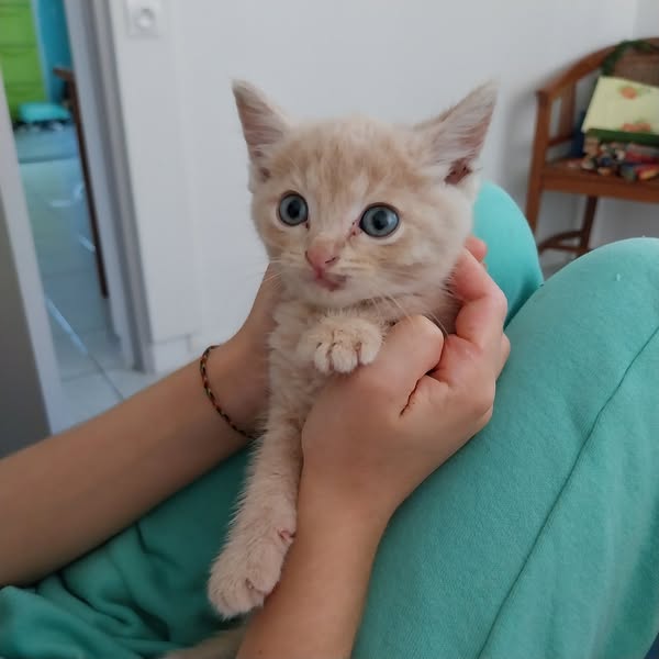 Moi, c’est Louky, une petite boule de caramel et de tendresse. J’ai été retrouvé seul sur la route des Makes, abandonné… mais je n’ai pas lâché prise. J’ai survécu, et maintenant, je suis prêt à vivre, à aimer, à ronronner dans les bras d’une famille pour la vie. Je suis joueur, câlin, curieux et j’apprends vite. Je suis le genre de chaton qui transforme une maison en cocon de bonheur.