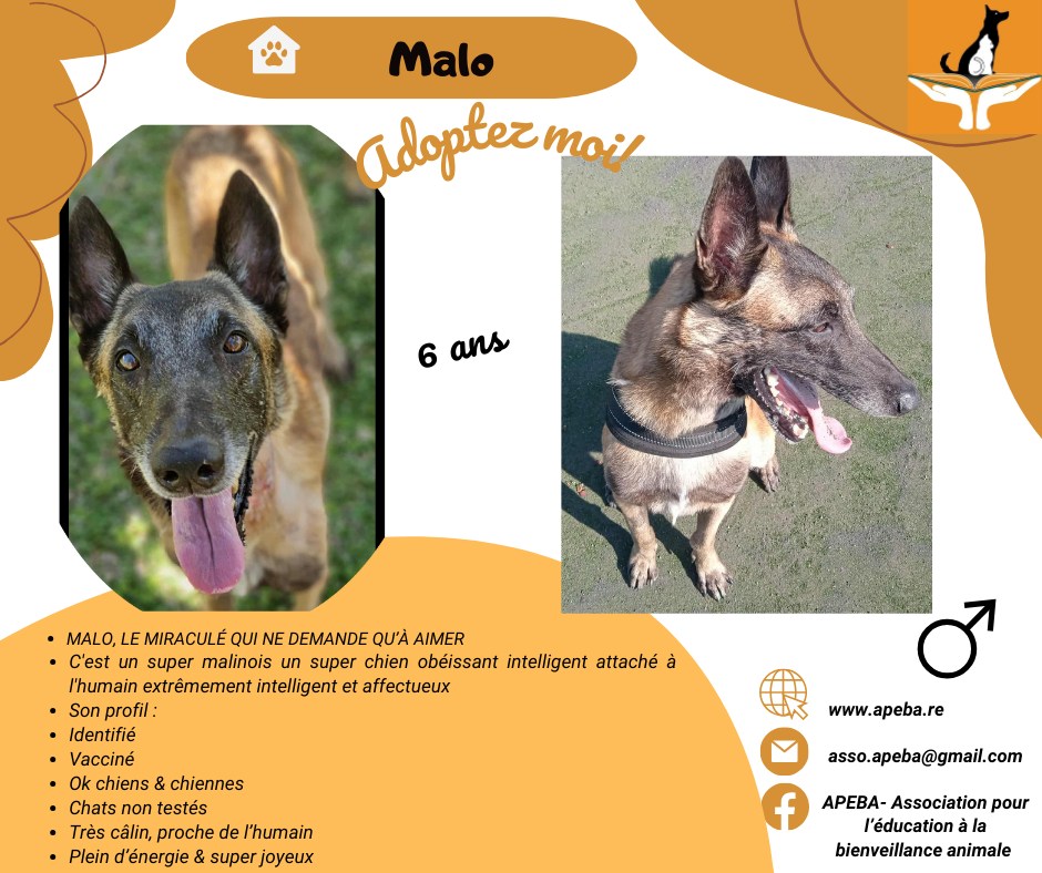 Bonjour, moi c’est Malo ! 😊 Jeune malinois, j’ai été retrouvé dans un état dramatique : blessé, incapable de marcher pendant des jours... Mais grâce aux soins vétérinaires et à l’amour reçu, j’ai repris des forces et aujourd’hui je cours, saute et gambade comme un vrai champion ! 🏅