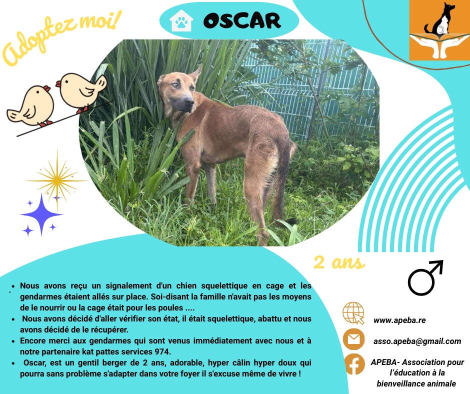 Oscar est un jeune berger qui a connu un début de vie très difficile : enfermé dans une cage, sans nourriture ni affection… complètement abandonné à son sort 💔 Nous l'avons sorti grâce à notre équipe APEBA - Association pour l'Education à la Bienveillance Animale et avec la collaboration des gendarmes de Saint-Paul 👮👮💪👏 Encore merci à eux 👏 👏 Aujourd’hui, nous recherchons d’urgence 𝘂𝗻𝗲 𝗳𝗮𝗺𝗶𝗹𝗹𝗲 𝗱’𝗮𝗰𝗰𝘂𝗲𝗶𝗹 pour cet adorable loulou qui ne demande qu’à donner et à recevoir de l’amour 💝 il est actuellement sur le terrain d'accueil et il mériterait d'avoir une belle famille car il est extrêmement affectueux 🥰🥰 💖 Son histoire vous touche ? Vous avez une place chez vous ? Du temps et de l’amour à consacrer à Oscar ? N'hésitez pas à nous contacter
