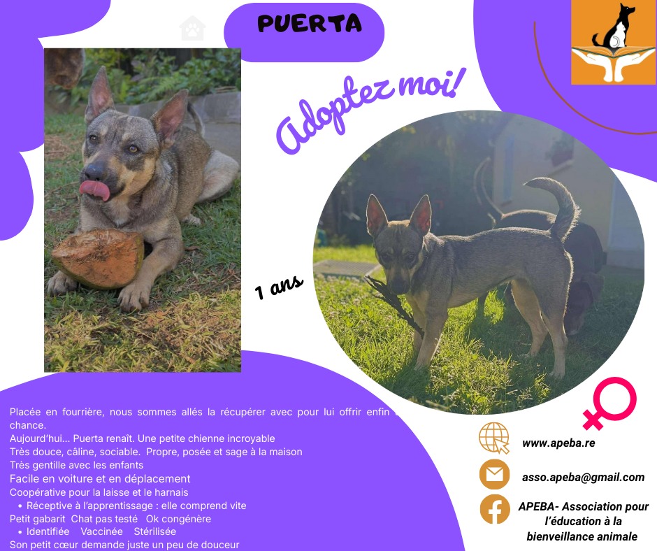 Moi, c’est Puerta. J’ai été retrouvée enfermée et affamée dans un squat insalubre, sans lumière ni soin, avec ma copine Rica. Nous avons été extraites de cet enfer grâce à une opération de police. En fourrière, j’étais terrorisée… mais une belle chaîne de solidarité m’a permis de sortir de là. Aujourd’hui, je découvre la vie, l’amour, et la douceur dans une famille d’accueil bienveillante. Je suis encore jeune, un peu timide, mais si attachante. Avec un peu de patience, je deviendrai une compagne fidèle et tendre.